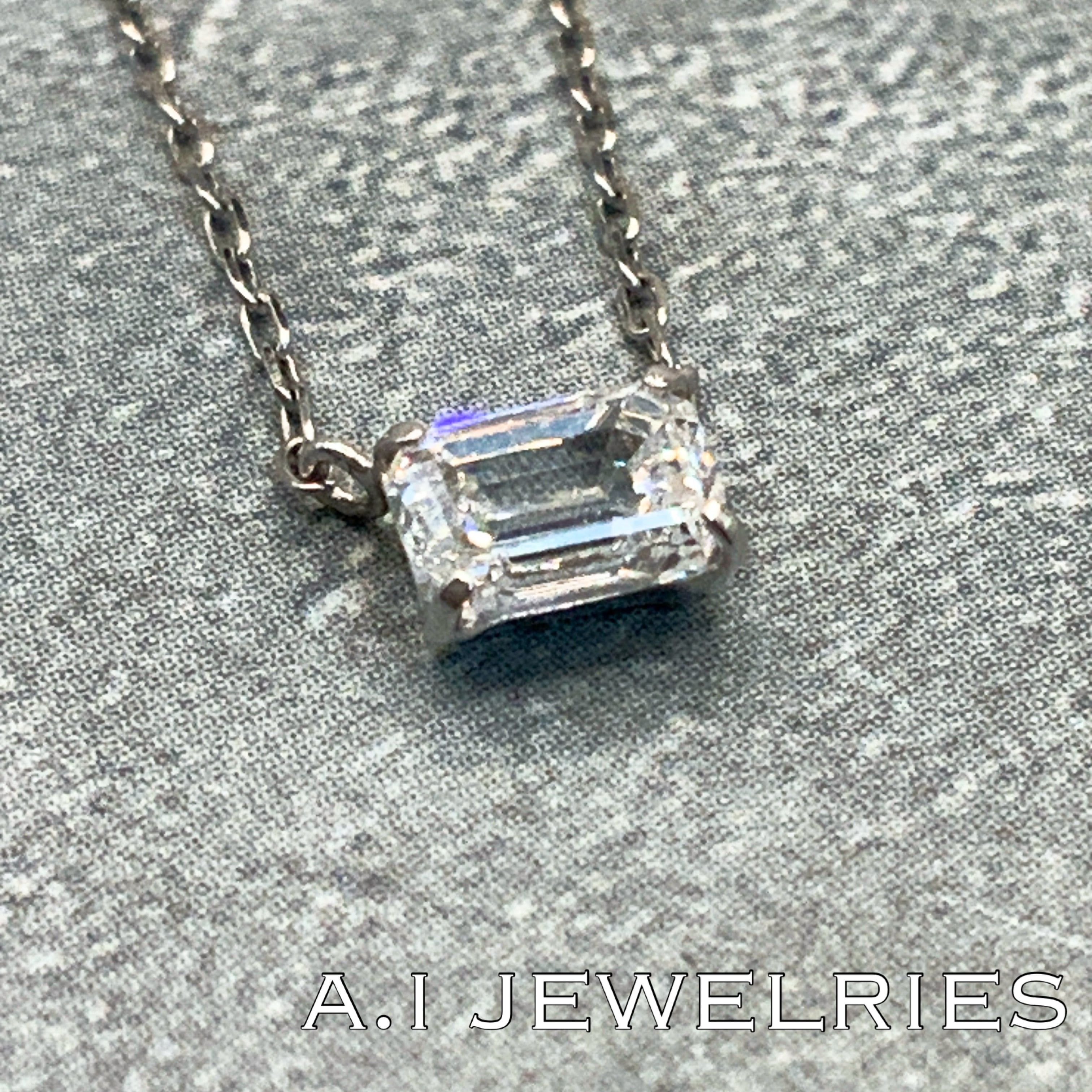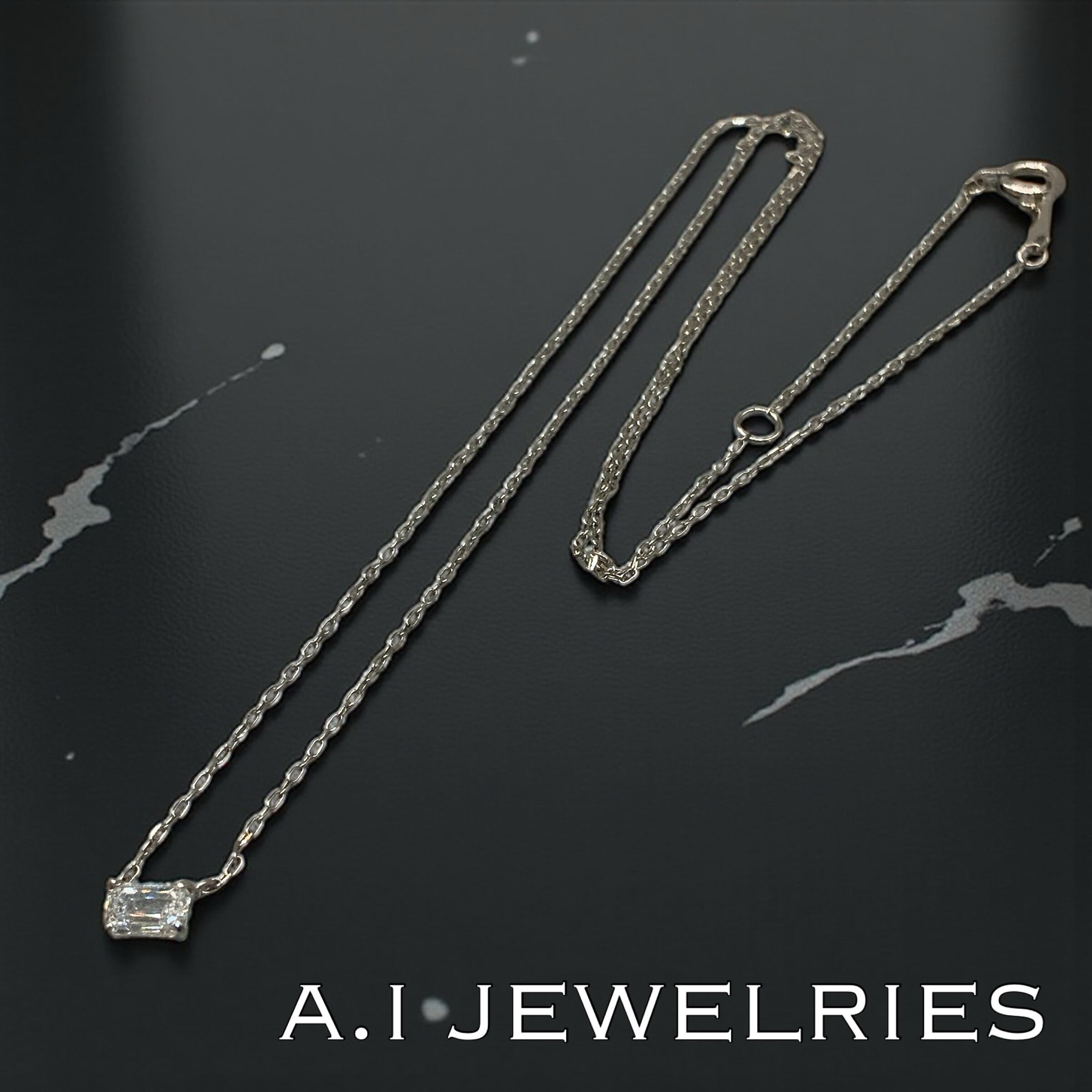 バゲットカット特有の透明感ある輝きと、プラチナのクールな艶めきが調和し、シンプルながら大人の気品を感じさせるデザイン。日常使いはもちろん、フォーマルなシーンでも上品に胸元を飾ります。