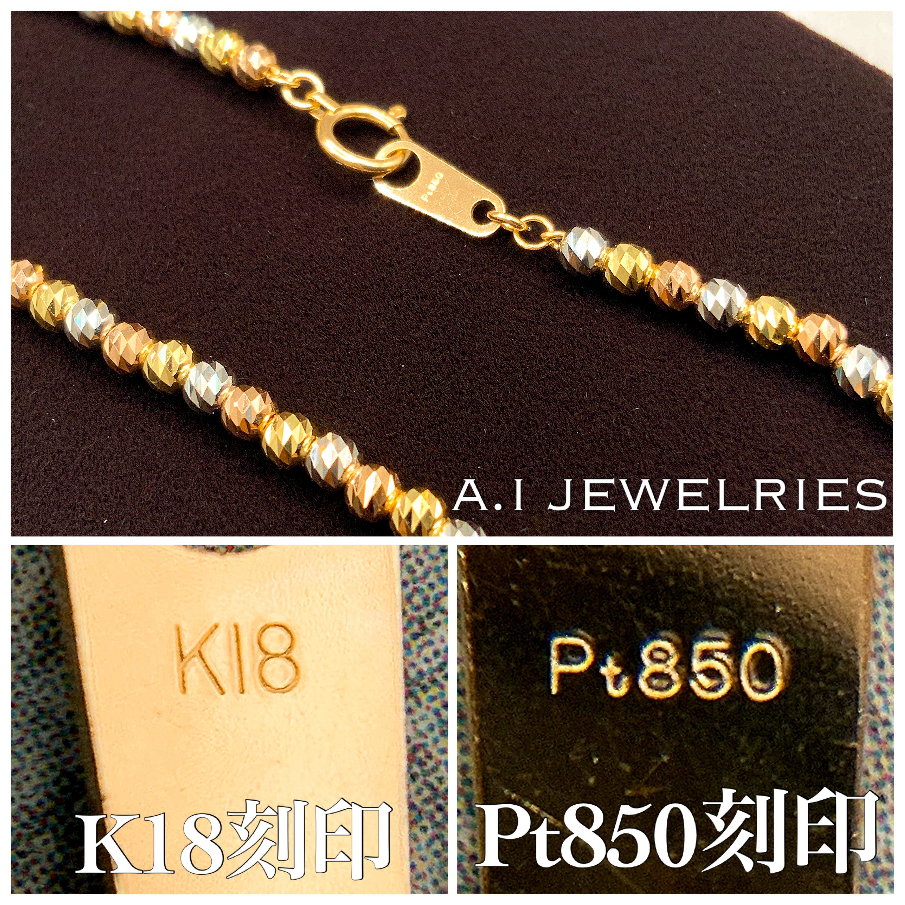 K18、Pt850刻印入りで安心のコンビジュエリー。本物のK18、PG、Pt850であることを保証する品質保証書付きです。メッキやGPではございません。
