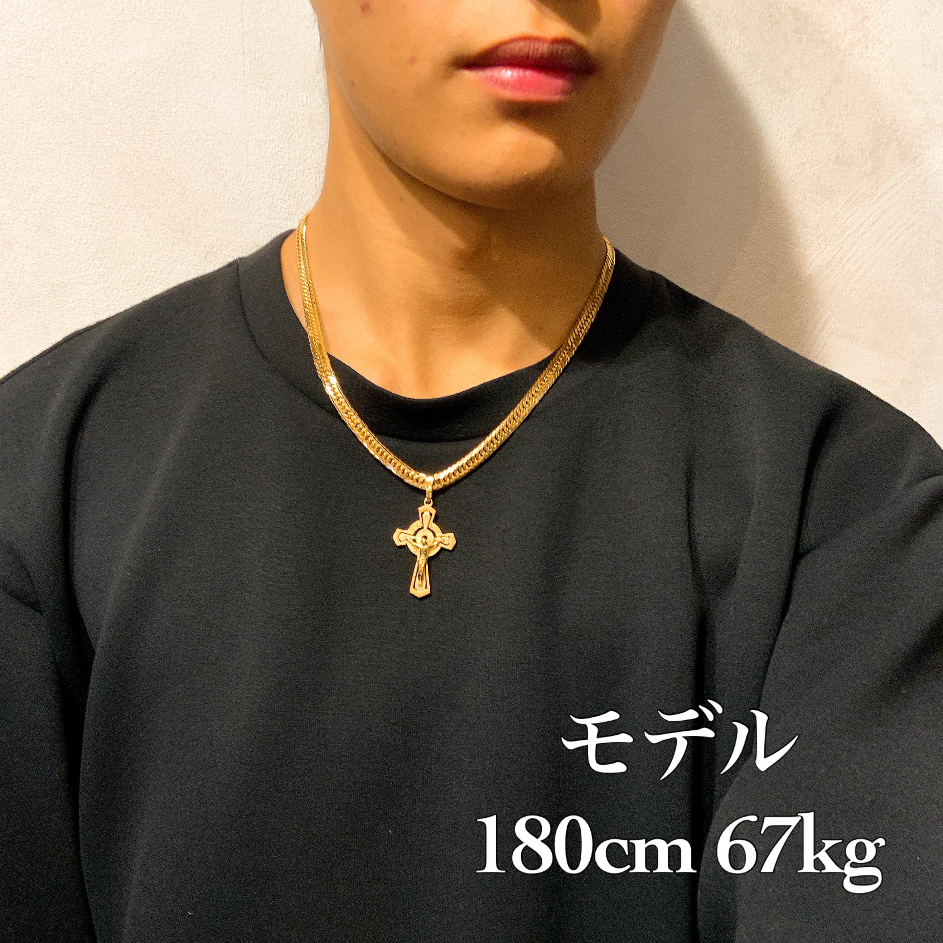 中央には立体的に造形されたジーザス像を配置しており、クロス部分はシャープなエッジと抜け感のあるデザインになっております。