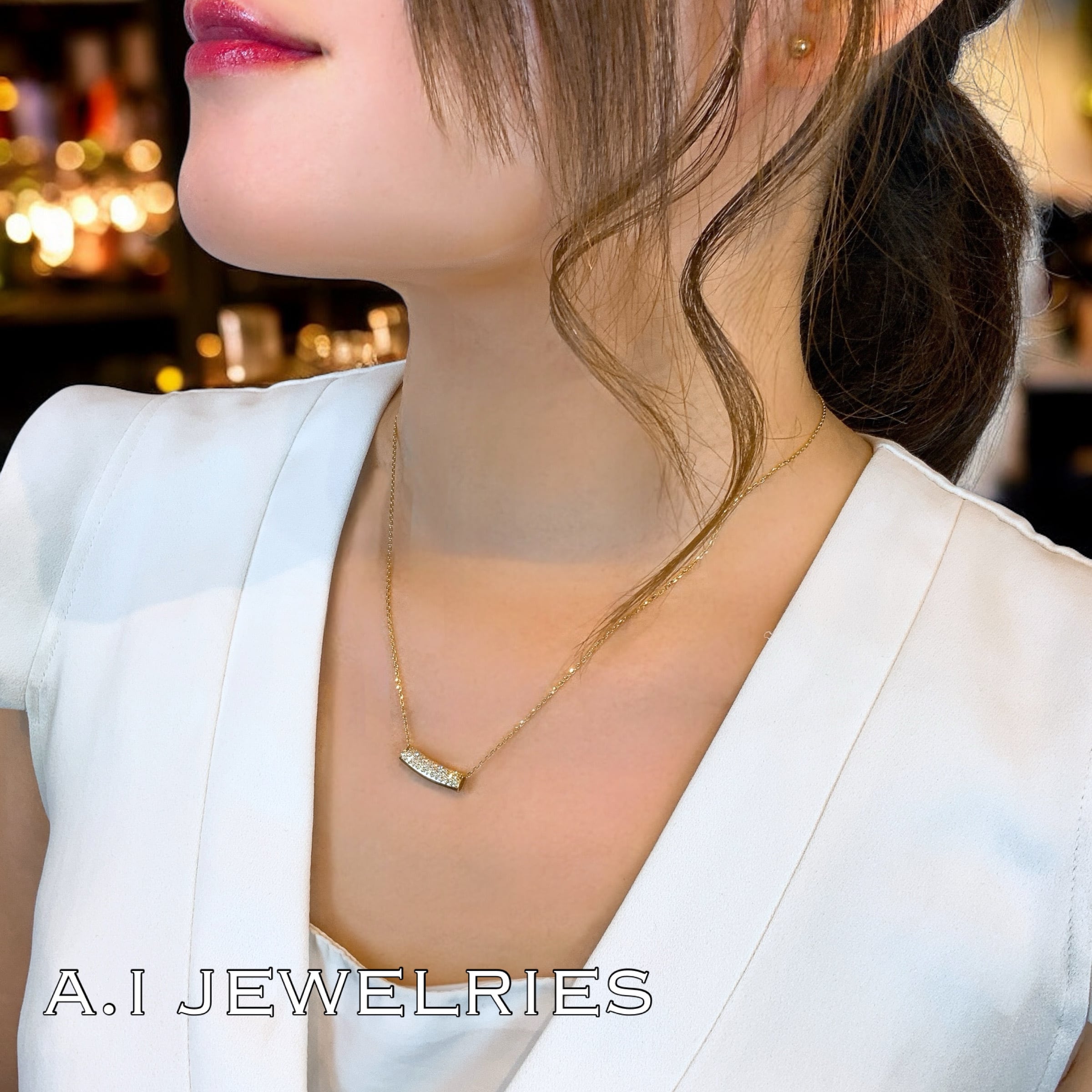 表面には繊細に並べられたダイヤモンドが華やかな輝きを放ち、胸元に上品なラグジュアリーを演出します。