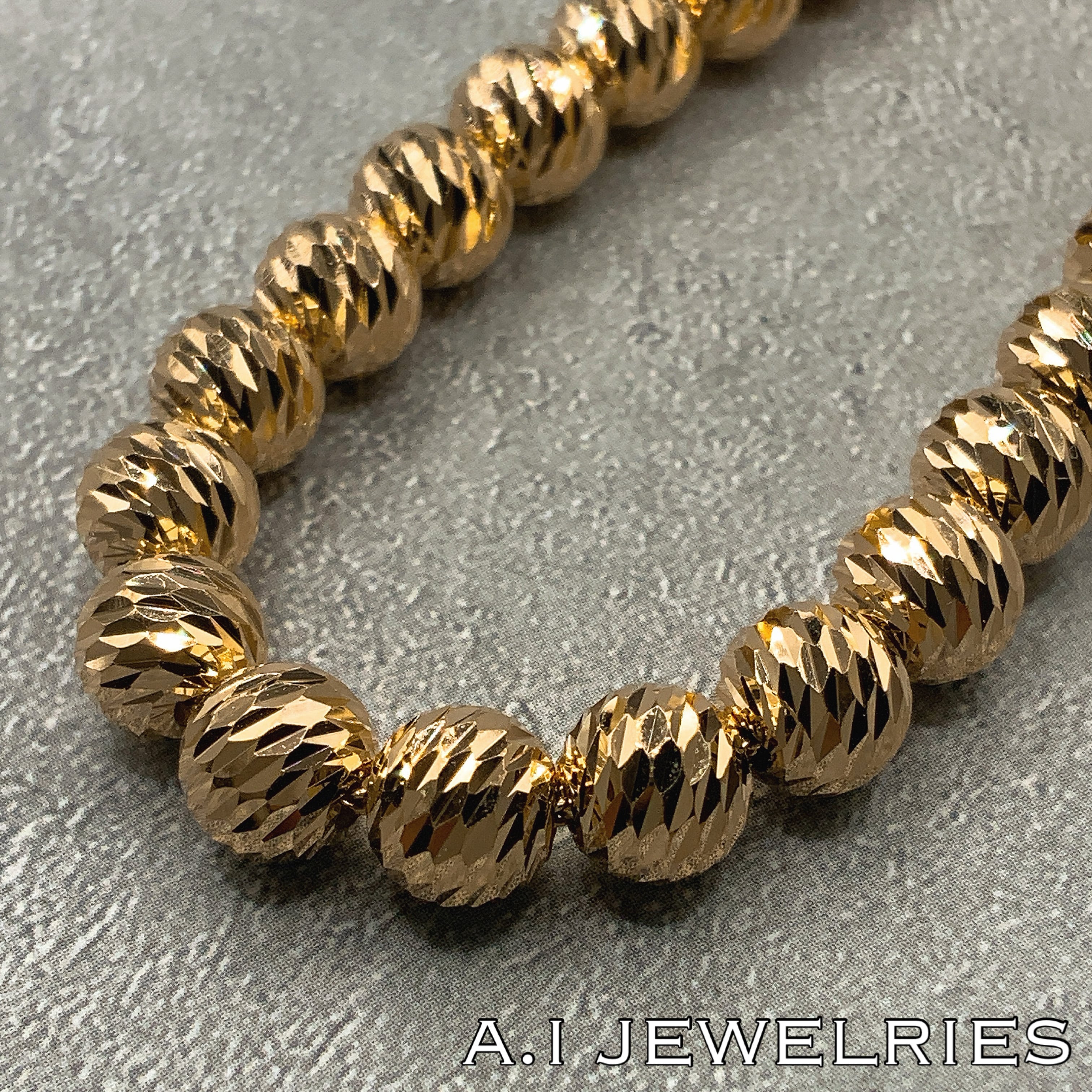 動くたびに輝きが変化し、ゴールドならではの高級感と華やかさを引き立てます。